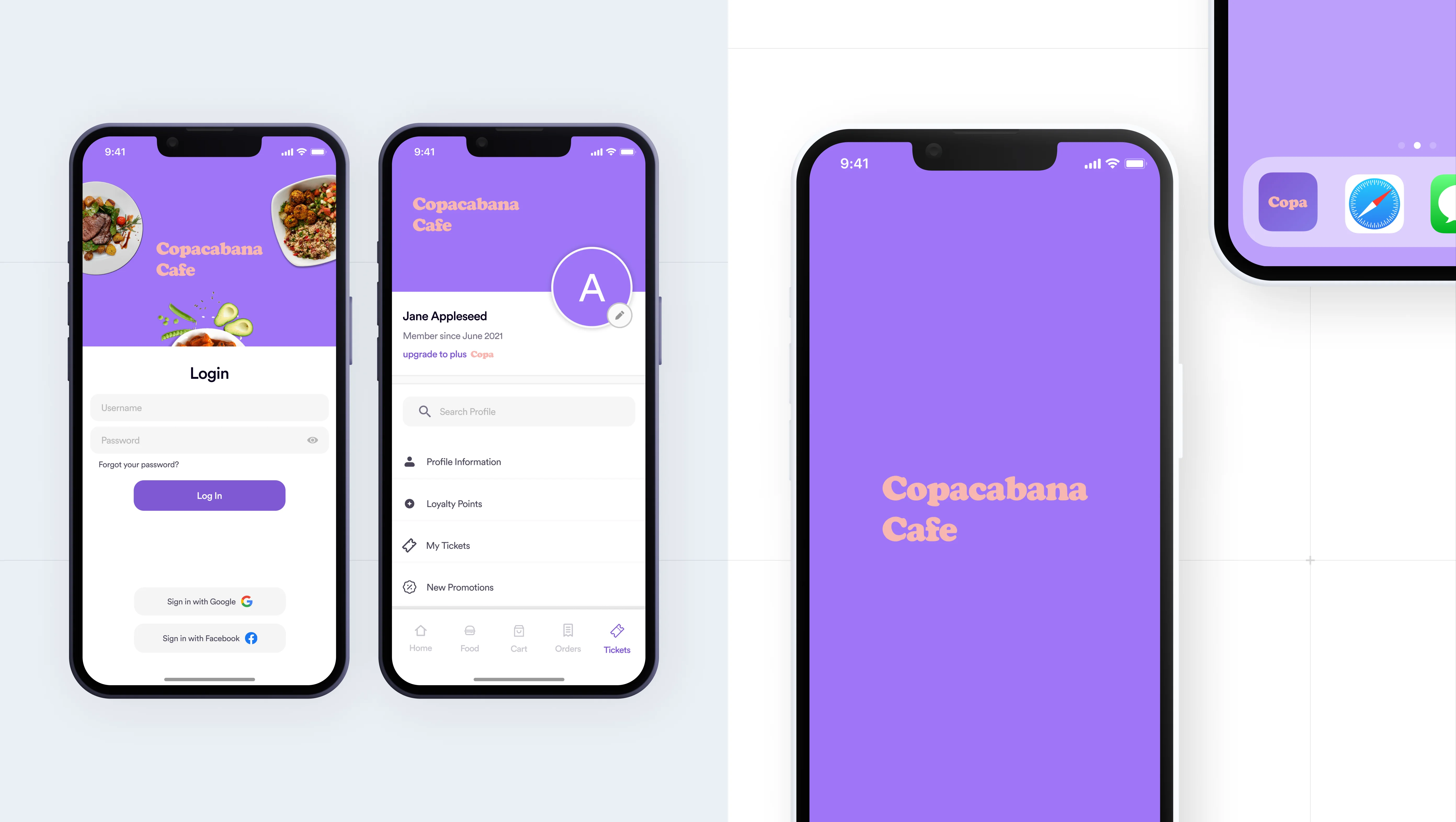 Personal accounts connect to all Copacabana cafes worldwide. Users use the app as their portal to the Copcabana experience , using the app to order food and enjoy live events under one streamlined flow.